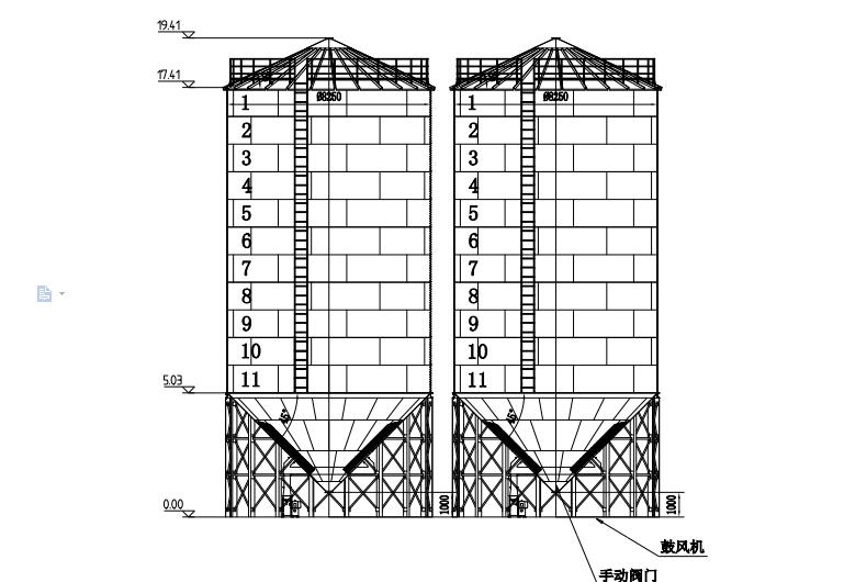 500T錐底鋼板倉主要用于存儲玉米。具有機械化程度高、易出料,使用壽命長。整倉容積:768m³;直徑: 8.2m;環(huán)梁高:5.53m,倉檐高:17.39m,總高:19.29m;錐頂角: 25。倉頂蓋板為δ1.0mm熱鍍鋅板,選用國產(chǎn)優(yōu)質(zhì)熱鍍鋅板,倉頂上設(shè)置自然通風窗、人孔、爬梯,倉頂用航空膠泥和防水墊圈密封,沿倉檐四周設(shè)有安全防護欄。